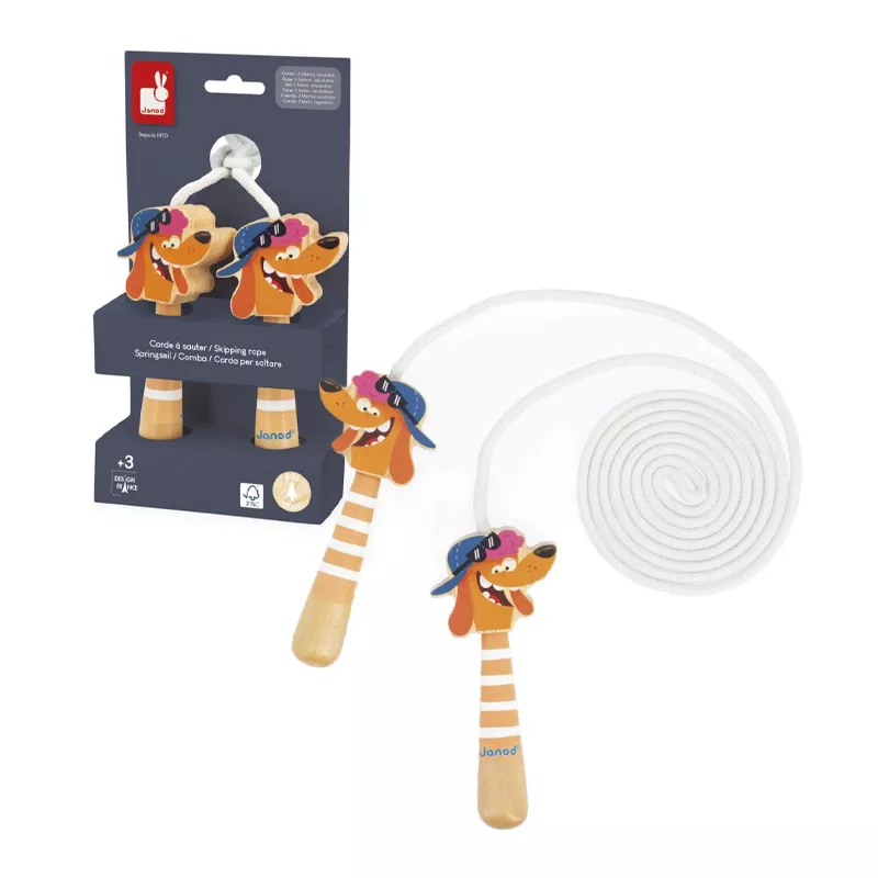 - Corda de saltar de 2 metros com divertidos cães de madeira nas pegas.