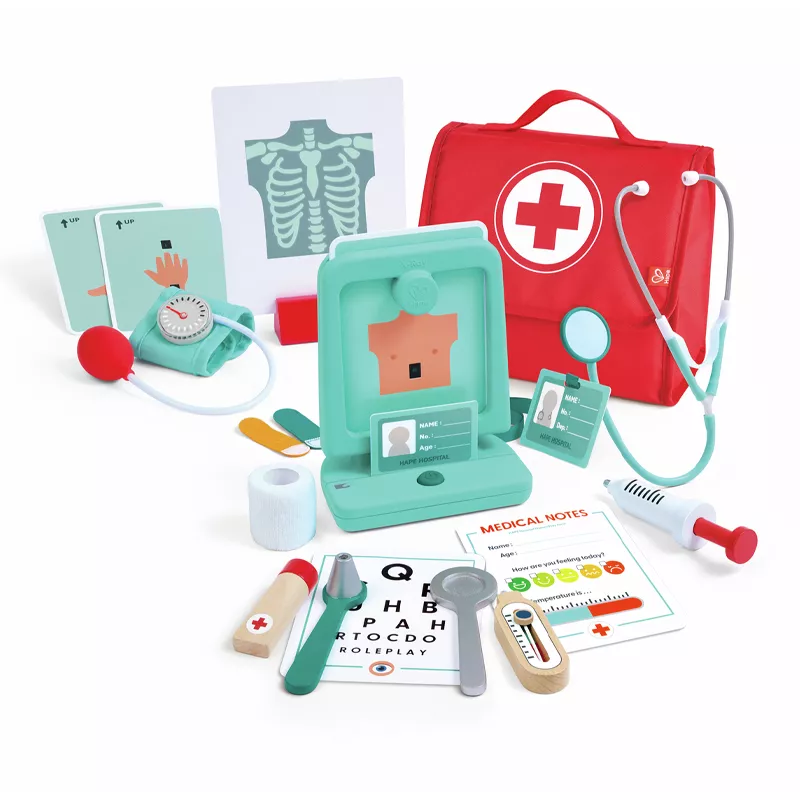 O conjunto médico Little Doctor é uma forma divertida e cativante de as crianças explorarem o papel de um médico através da brincadeira. Com ferramentas realistas, como uma máquina de raios X com som e projetor, estetoscópio, ligaduras, pensos e até um monitor de tensão arterial funcional! Um conjunto que combina o jogo simbólico com a aprendizagem, ao mesmo tempo que estimula o desenvolvimento da empatia, da comunicação e da motricidade fina e ajuda as crianças a ultrapassar eventuais medos das consultas médicas.Dos 3 aos 8 anos de idade