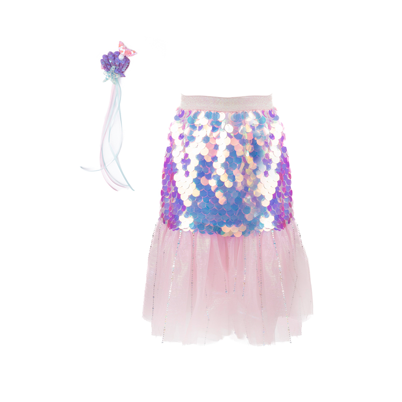 - Saia com grandes lantejoulas brilhantes, abas de tule macio e bonitos pormenores iridescentes.