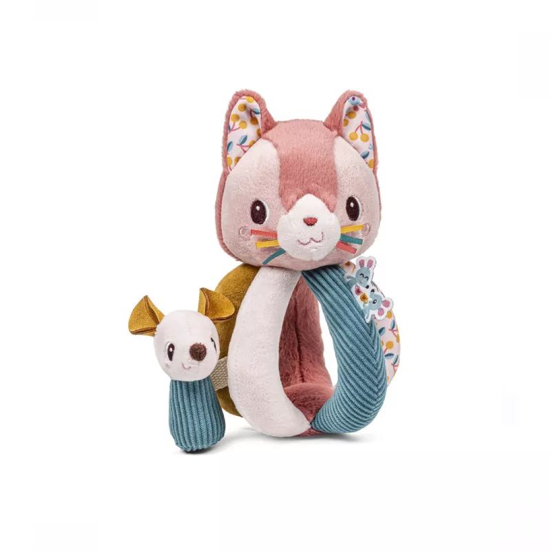- Chocalho com diferentes texturas, som de farfalhar, chocalho e um chocalho de ratinho para brincar.