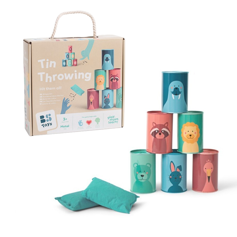 Quem consegue atirar o maior número de latas ao chão com um só lançamento? Um jogo de pontaria divertido, ideal para brincar ao ar livre com a família ou para organizar competições divertidas em celebrações e festas de aniversário. Com 3 sacos de lançamento e 6 latas divertidas ilustradas com animais de um lado e numeradas de 1 a 6 do outro.A partir dos 3 anos