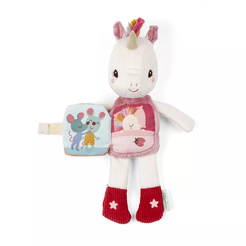 - Pequeno unicórnio de peluche Lena com livro em tecido.