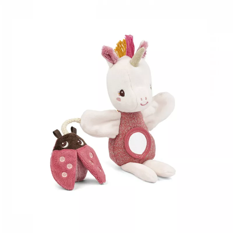 Transforme a Lena numa adorável marioneta para brincar! Colocando os dedos nas suas mãos, o unicórnio Lena ganhará vida e tornar-se-á um verdadeiro entretenimento para os mais pequenos. Também está cheia de surpresas para descobrir: espelho, sino, texturas e uma divertida joaninha pendurada que estala quando é apertada - nós adoramos!A partir dos 6 meses