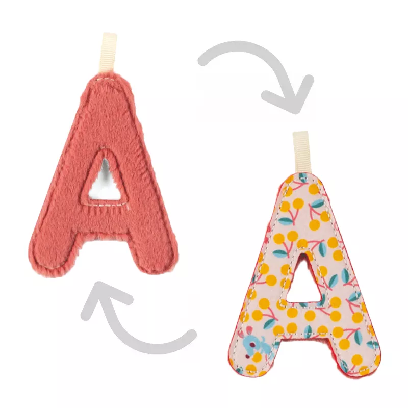 Decore o quarto dos mais pequenos com esta bonita letra A em tecido reversível com costura fosforescente que brilha no escuro! Crie um nome, uma mensagem ou um desejo com as outras letras para pendurar na parede, na cabeceira da cama ou na porta. E para o arco-íris mais bonito, algumas das letras podem ser rodadas para mostrar uma cor e um padrão diferentes. Dê um toque de magia ao seu quarto com as letras Lilliputiens!