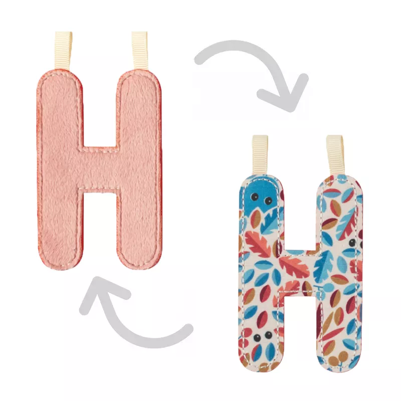 - Letra H em tecido reversível, com 2 cores diferentes (cor-de-rosa e estampado de folhas).