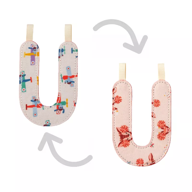 - Letra U em tecido reversível, com 2 estampados diferentes (aviões e fulvo Stella).