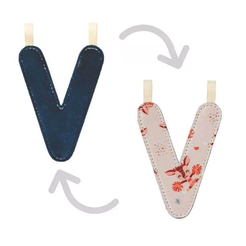 - Letra V em tecido reversível, com 2 cores diferentes (azul e estampado fulvo Stella).
