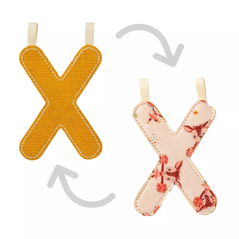 Decore o quarto dos mais pequenos com esta bonita letra X em tecido reversível com costura fosforescente que brilha no escuro! Crie um nome, uma mensagem ou um desejo com as outras letras para pendurar na parede, na cabeceira da cama ou na porta. E para o arco-íris mais bonito, algumas das letras podem ser rodadas para mostrar uma cor e um padrão diferentes. Dê um toque de magia ao seu quarto com as letras Lilliputiens!